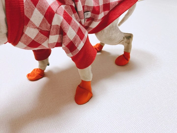 두께가 두툼하여 착용 시에 약간의 어려움을 겪을 수 있으나, 산책 시 쉽게 안 찢어져 내구성이 좋습니다. 착용 시 입구 부분을 벌려 발등 위에서부터 신기면 보다 쉽습니다.