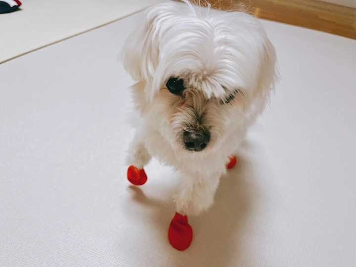 저희 강아지 첫째인 똘망이에게도 신겨 봤는데요. 몸무게 3kg 정도 되는데 쉽게 벗겨집니다. 말티즈 견종은 사이즈 설명에서도 XXS 사이즈를 추천합니다.