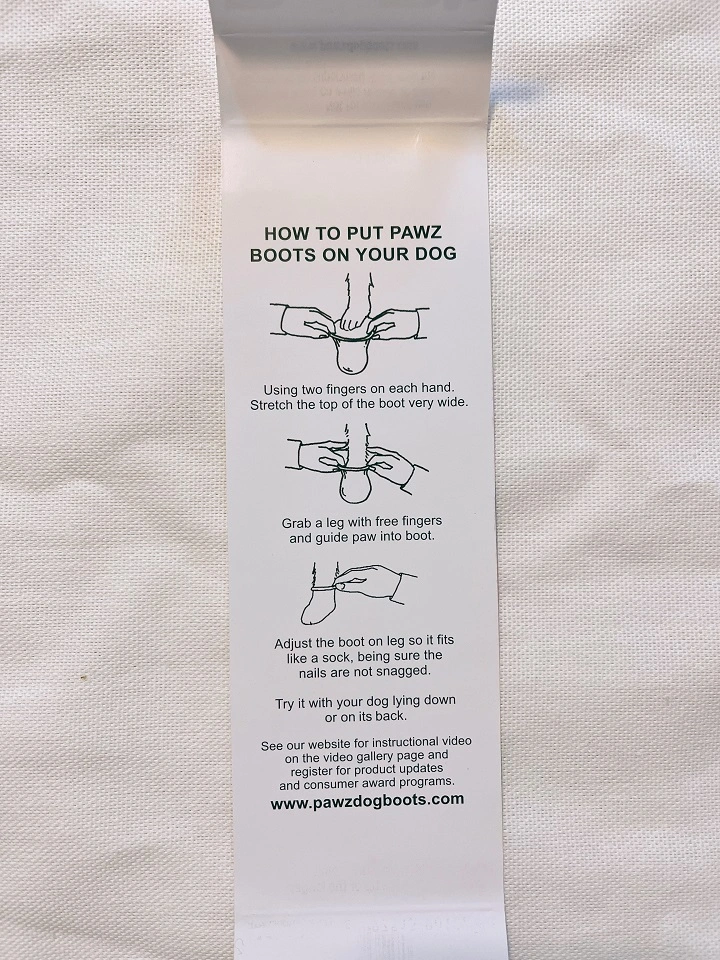 한 통에 총 12개로 구성되어 있으며 안쪽에 신기는 설명서가 그림으로 쉽게 설명되어 있습니다. 뒤쪽에 보시면 사이즈와 그에 맞는 강아지 종까지 친절하게 표기되어 있습니다.