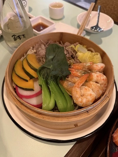 차분하게 차례로 뱃속을 채우기 위해 시작은 가볍게 갑니다. 숙성된 날것의 신선함을 맛볼 수 있는 사시미, 부담 없이 가볍게 먹기 좋은 식감으로 제공되는 찜 요리. 구성으로 사시미는 광어, 연어, 참치, 전복이 나오며 찜 요리로는 채소 4가지와 새우, 차돌박이.